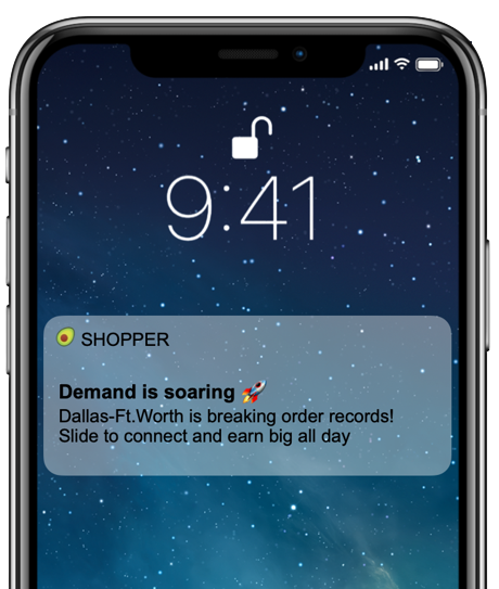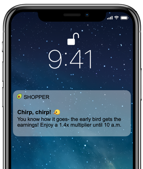 I worked with the operations team to create financial incentives to encourage Shoppers to log on and accept orders. Once these were in place, I created a series of push notifications, directed at the Shoppers, to drive engagement and boost their earnings during high-demand hours. Top thought on my mind: Make messages feel fun, urgent, and valuable, all within 120 characters or less. In this case, less really was more.