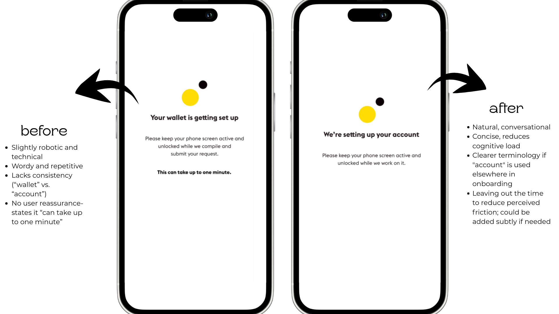 Why it works - The updated copy is shorter, friendlier, and easier to read, especially in a moment where the user is waiting. It removes technical jargon, speaks with a calm tone, and focuses on clear guidance, all key principles of effective UX writing.